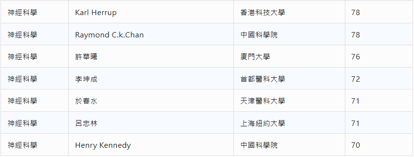 對於神經科學領域:蒲慕明,賀永,龔啟勇,蔣田仔,魯白,李曉江,臧玉峰等人入選;