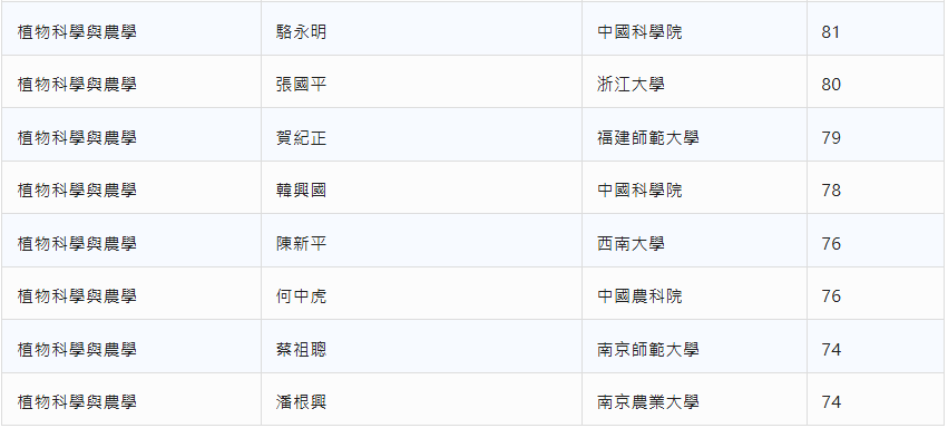 對於植物科學與農學領域:朱永官,張福鎖,趙方傑,張建華,沈其榮,楊肖娥,喻景權等人入選;