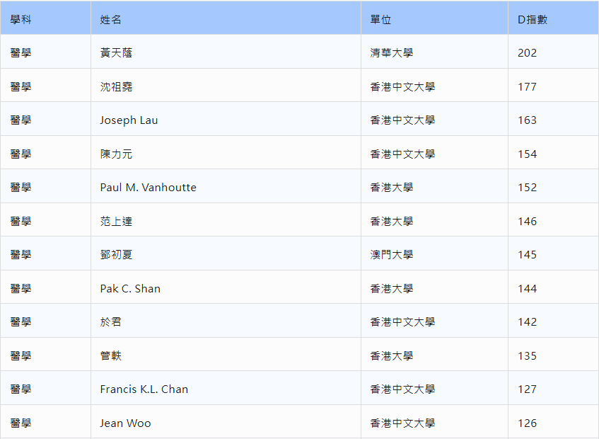 D-index(學科H-index)學者排名指標,僅包括被調查學科的論文和引用值。根據官網介紹,D-index細分為化學,電腦科學,數學,法律,材料科學等26個細分領域。