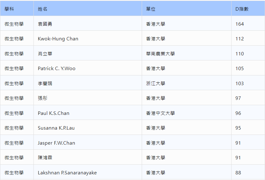 在微生物學領域,對多達44555名研究人員進行了分析。如果研究人員的大部分出版物是在微生物學領域,則將其納入審查的D指數閾值確定為40。進入頂尖研究人員排名的接受標準是基於D指數、在特定領域的貢獻比例、研究人員的獎勵和成就。