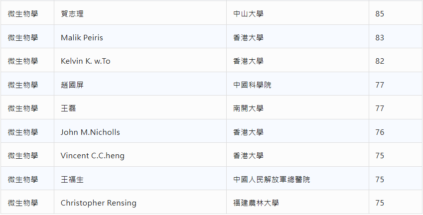 對於微生物學領域:袁國勇,肖立華,李蘭娟,張彤,陳鴻霖,賀志理,趙國屏等人入選;