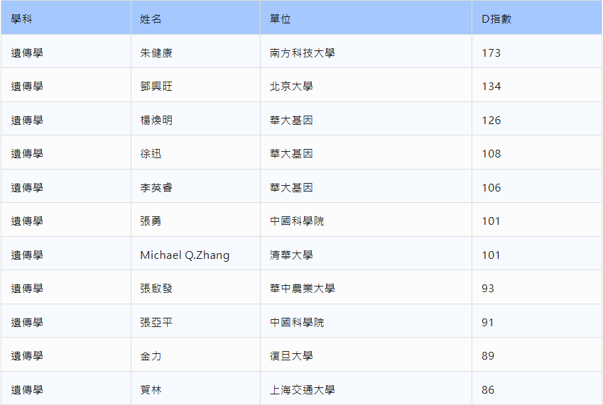 在遺傳學領域,對多達6162名研究人員進行了分析。如果研究人員的大部分出版物是在遺傳學領域,則將其納入審查的D指數閾值設定為40。進入頂尖研究人員排名的接受標準是基於D指數、在特定領域的貢獻比例、研究人員的獎勵和成就。