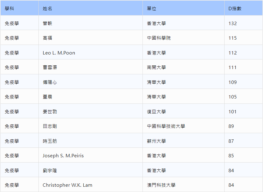 在免疫學領域,對多達11980名研究人員進行了分析。如果一個學者的大部分出版物是在免疫學領域,那麼他被納入評估的D指數閾值是40。進入頂尖研究人員排名的接受標準是基於D指數、在特定領域的貢獻比例、研究人員的獎勵和成就。