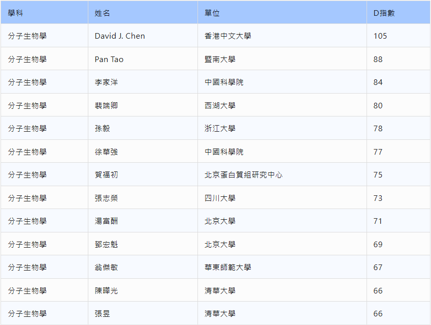 在分子生物學領域,對多達6162名研究人員進行了分析。如果一個學者的大部分出版物是在分子生物學領域,那麼他被考慮的D指數門檻是40。進入頂尖研究人員排名的接受標準是基於D指數、在特定領域的貢獻比例、研究人員的獎勵和成就。
