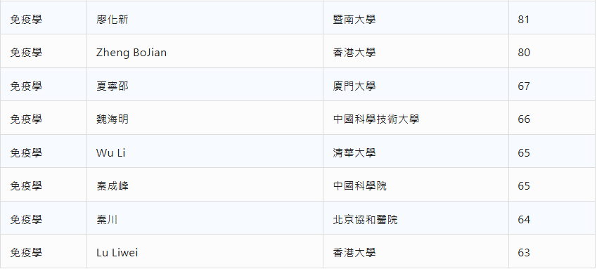 對於免疫學領域:管軼,高福,曹雪濤,傅陽心,董晨,姜世勃,田志剛,時玉舫,劉宇隆等人入選;