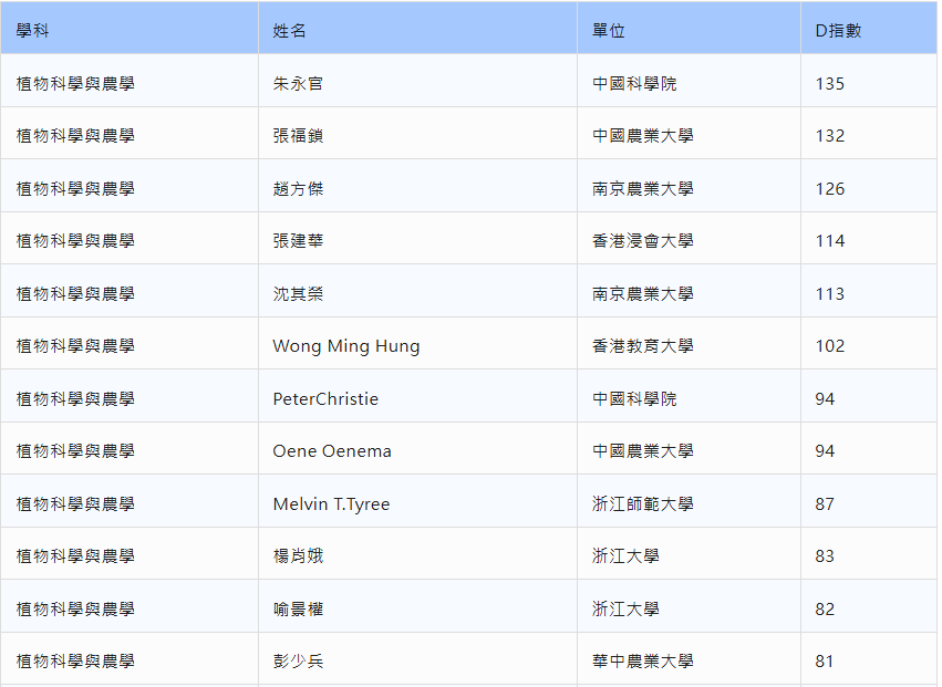 在植物科學與農學領域,對多達10707名研究人員進行了分析。如果發表的大部分論文是在植物科學與農學領域,則接受該學者的D指數門檻設定為30。進入頂尖研究人員排名的接受標準是基於D指數、在特定領域的貢獻比例、研究人員的獎勵和成就。