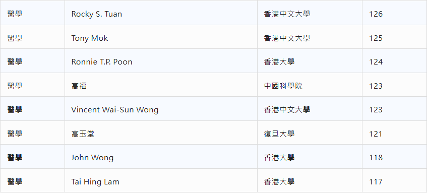 在醫學領域,對多達70665名研究人員進行了分析。如果一個學者的大部分出版物是在醫學領域,那麼他被納入審查的D指數門檻是70。進入頂尖研究人員排名的接受標準是基於D指數、在特定領域的貢獻比例、研究人員的獎勵和成就。