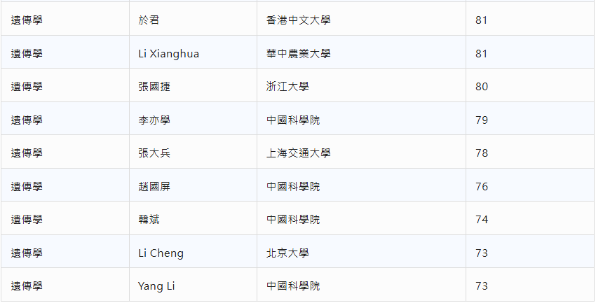 對於遺傳學領域:朱健康,鄧興旺,楊煥明,徐訊,李英睿,張勇,張啟發,張亞平,金力,賀林等人入選;