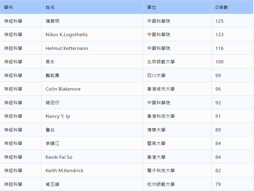 在神經科學領域,對多達30084名研究人員進行了分析。如果一名學者的大部分出版物是在神經科學領域,那麼他被考慮的D指數閾值為30。進入頂尖研究人員排名的接受標準是基於D指數、在特定領域的貢獻比例、研究人員的獎勵和成就。