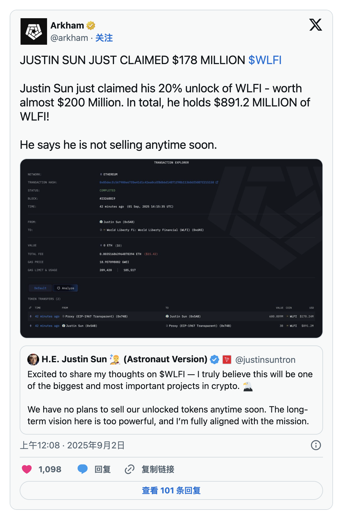 Arkham數據也顯示,孫宇晨目前控制約5.95億WLFI代幣,以目前市價計算約1.07億美元。這個餘額代表他未鎖定的分配,佔他總持有量的約20%。根據他最初的購買和解鎖條款,約24億WLFI仍在限制期內鎖定,這一數字與分析師報導的鏈上估算一致。