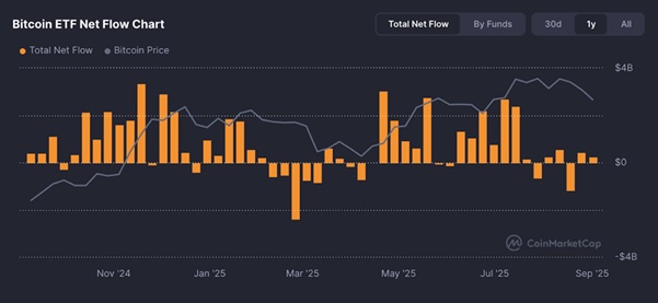 例如,Strategy 在 8 月僅增持 1,200 BTC,而其他公司平均僅增持 343 BTC。這股疲態也反映在 ETF 資金流入上,自 7 月底開始逐步放緩。