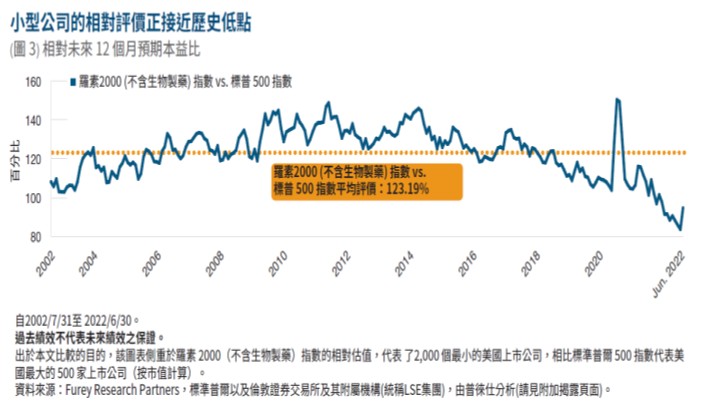 當然,對美國較小型的公司來說,對評價的論點很少比今天更引人注目,從2021年第四季度開始美國股票的廣泛拋售,已經使較小型公司的評價跌至接近歷史低點(圖 3),從歷史上看,當相對評價達到同樣極端的水平,較小型公司通常會在未來許多年表現會優於較大的同業。