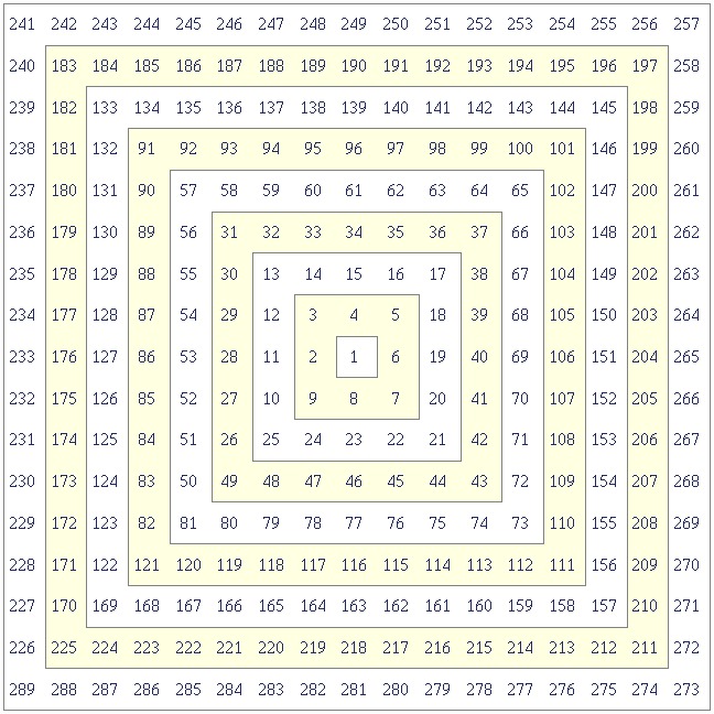江恩引用法拉第名言:「自然界中只有數學,數學是一切的基礎。」他使用圓、正方和三角形,在 360 度循環中尋找時間、價格和空間的阻力點。四方圖的螺旋結構從中心「1」開始,順時針展開,數字「2」在其左,猶如金字塔塔尖,象徵宇宙起點。每個從中心延伸的主要角度線可用一元二次方程式表達,例如奇數平方數列(9, 25, 49, 81, 121, 169, 225)及偶數平方數列(4, 16, 36, 64, 100, 144),可用公式(2n+1)² = 4n² + 4n + 1表達。這些數列形成拋物線曲線族,當數字序列呈特定角度時,價格可能出現拐點,與市場走勢對應。