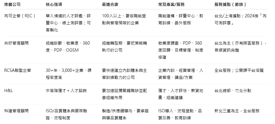 資料來源:各公司官網公開資訊。芮可企管(評量中心/測評雲)、共好(服務清單/聯絡)、聯聖(歷史與家數/課程商店)、H&L(據點/獵才)、科建(ISO/據點)。