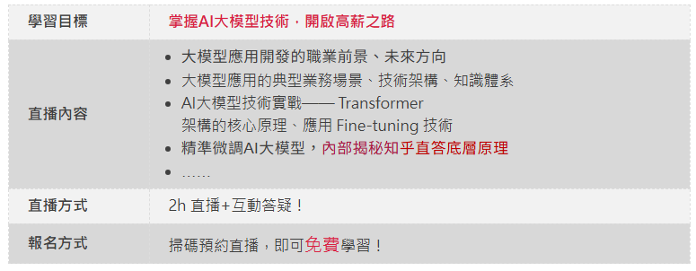 課程講解大模型必備的RAG、AI Agent、Transformer 架構的核心原理、應用 Fine-tuning 技術……等等,直擊大模型技術實戰,讓你從容面對AI技術革新!