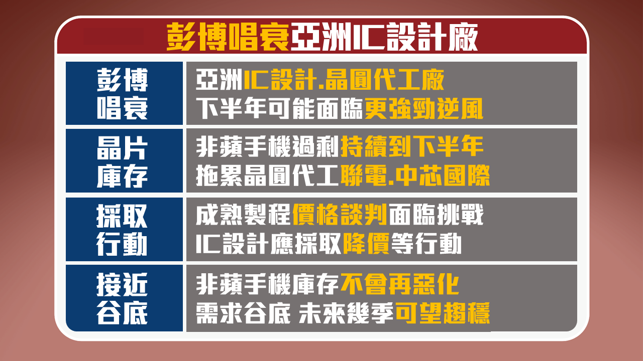 彭博資訊分析師:亞洲IC設計業者與晶圓代工廠,下半年將面臨更強勁的逆風。主因:非蘋手機市場仍面臨庫存去化壓力、抑制晶片需求,牽動手機晶片龍頭聯發科(2454)與其他手機供應鏈後市。