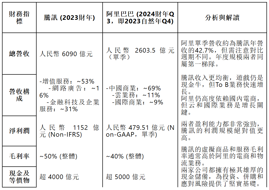 市值:歷史上兩者市值交替領先,常處於中國上市公司前兩位。當前(2024年中)騰訊市值總體略高於阿里。