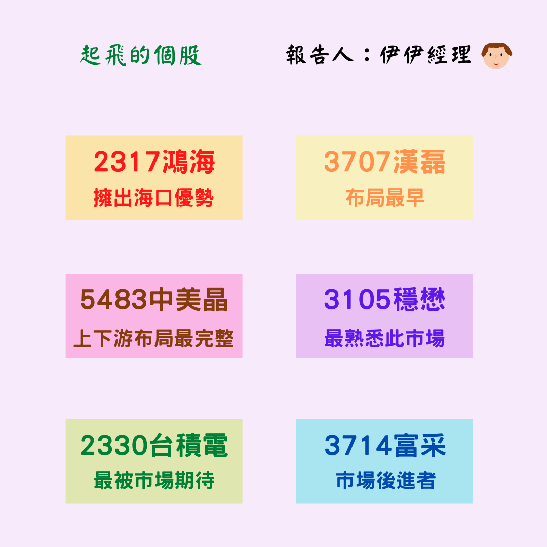 也有其他的個股可以留意,不論晶圓加工、基板、封測、磊晶製成大家都各司其職喔!