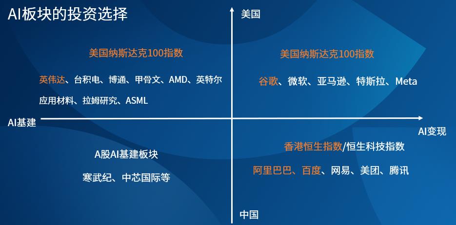 今天的AI投資,正好可以對照這種歷史局面。AI同樣分為兩大方向:一是“基建類”,包括算力、晶片、雲服務等;二是“變現類”,即最終的應用與消費層。再疊加中美兩大陣營,整個AI投資版圖可分為圖中的四個象限。