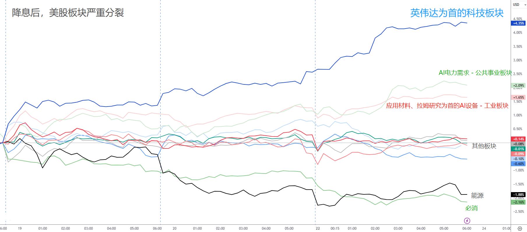 美國股市:自從聯準會上週降息後,由於點陣圖不及預期,美股板塊出現嚴重分裂。上漲的板塊基本上都圍繞AI的基建需求,近期不斷有相關消息面刺激市場。昨天美盤初,英偉達宣佈向OpenAI投資1000億美元,引發市場熱情。英偉達、甲骨文、應用材料與拉姆研究等個股股價暴漲,帶動美股三大指數齊創新高。然而包括微軟、Google、亞馬遜以及其他板塊的走勢整體不佳。這種板塊的分裂背後是AI的泡沫風險。