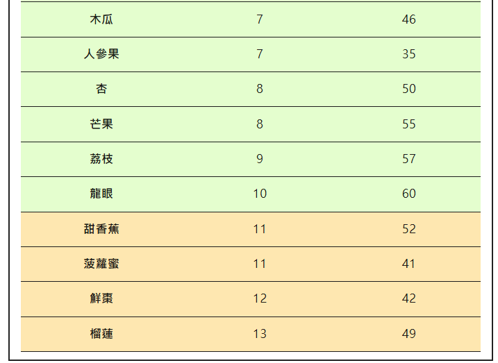 排名越高,血糖負荷越低,意味著吃相同重量的水果,對血糖的影響越小,不知道吃什麼水果的糖友可以作為參考: