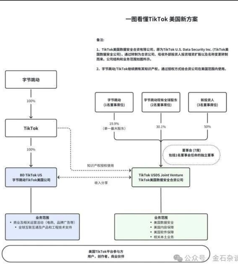 根據方案,該合資公司將由字節跳動持有19.9%的股權,以符合美國法律;字節跳動現有全球股東合計持有30.1%股權;新投資人合計持有50%股權。字節跳動仍為該公司的最大單一股東。董事會共設定7個席位,其中字節跳動1個席位,字節跳動現有全球股東2個席位,新投資人3個席位,此外還有1名由董事會任命的獨立董事。