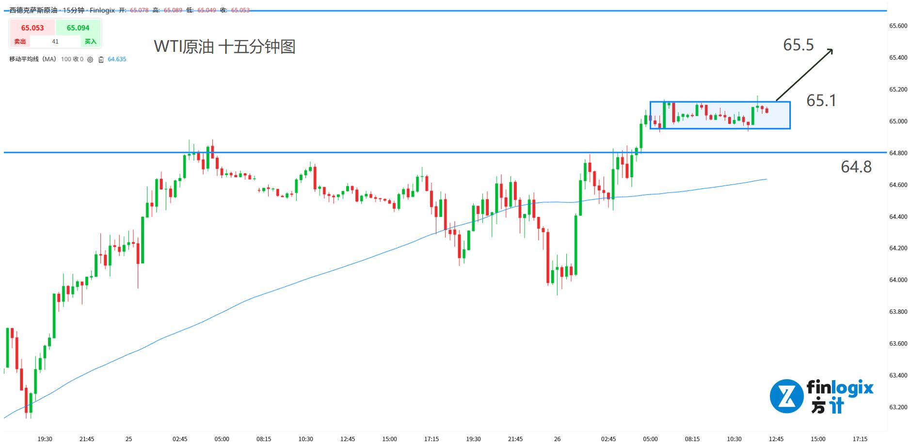 技術面:100均線向上,且突破了前高點阻力,現價在65關口暫時企穩形成價格靜區。關注向上突破的跟隨看漲機會,上方阻力在前高點65.7,但動能可能沒法到這麼高位置,考慮分批平倉。