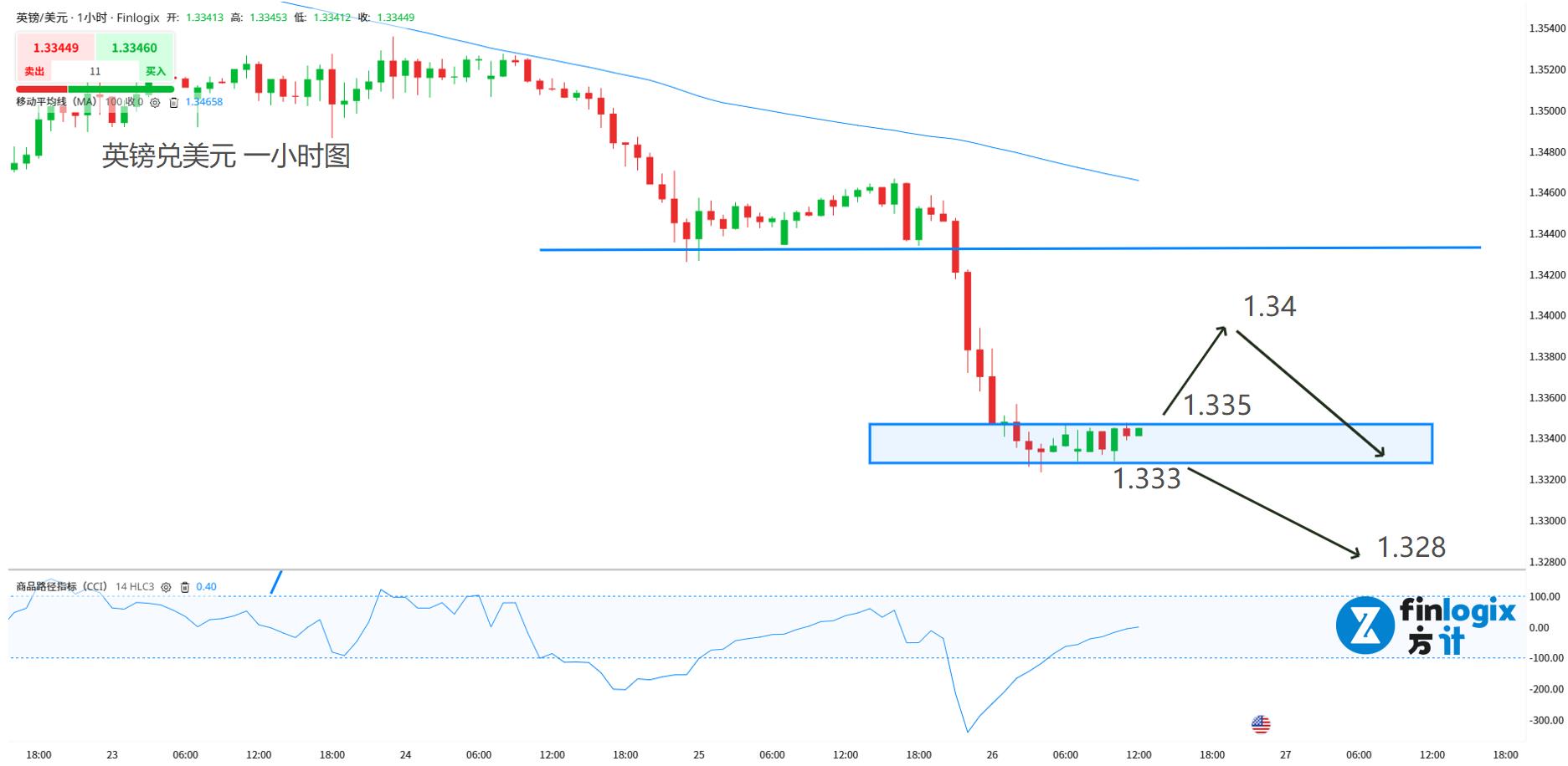 日內交易策略:(趨勢跟隨)突破1.333順勢看跌