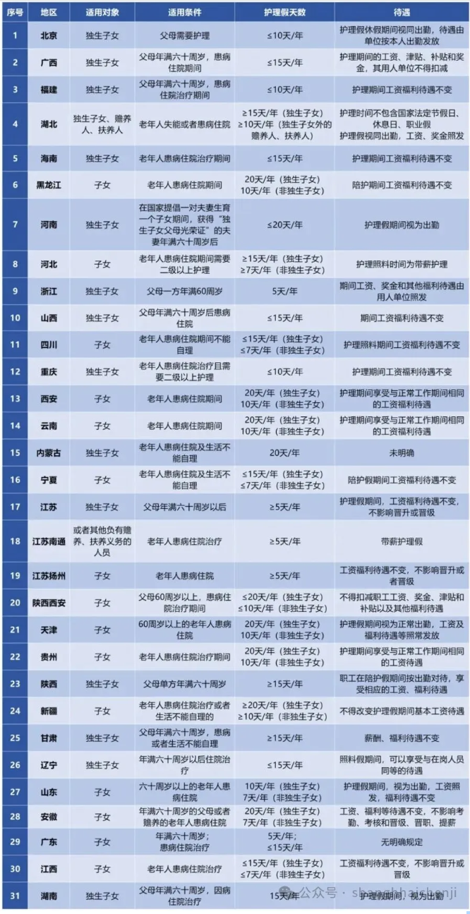 在已推出獨生子女照護假的地區,獨生子女每年可享有5~20天不等的假期。其中,值得注意的是,還有10餘省份,非獨生子女同樣可享有護理假,不過假期天數少於獨生子女。例如,山東、安徽、寧夏、四川、江西、湖北規定,非獨生子女每年可獲得最多7天護理假,天津、雲南、黑龍江、貴州、新疆達到10天。
