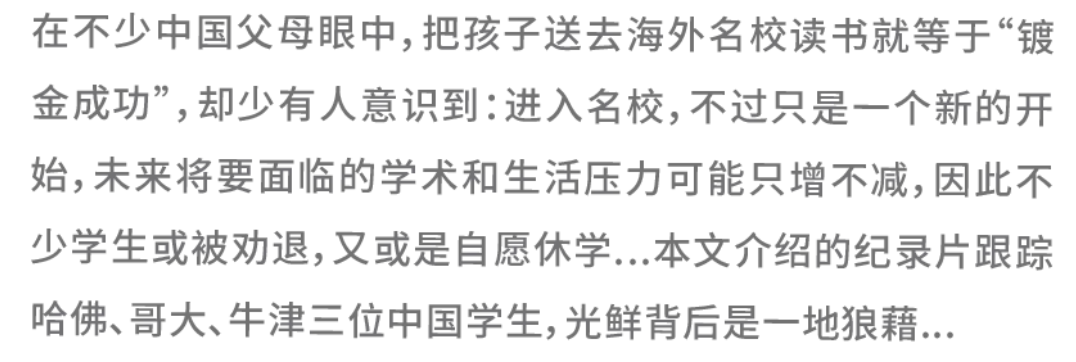 為瞭解答這個問題,鳳凰衛視就將鏡頭對準了就讀於哈佛、牛津、哥大的三位中國學生,那些經歷了萬千鮮花和掌聲而進入名校就讀的中國學生到底過著怎樣的生活,人們在這部紀錄片裡找到了些許答案。