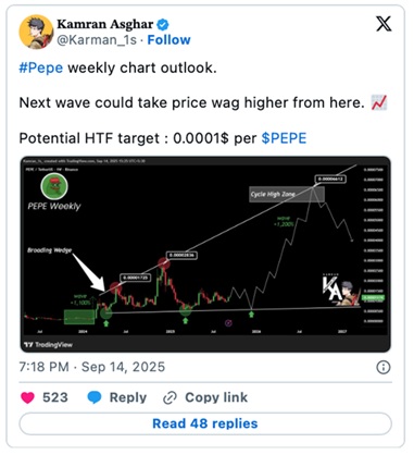 知名加密交易員Kamran Asghar在PEPE的圖表中識別出一個擴散楔形形態,暗示價格可能在2026或2027年前後出現新的週期性擴張。