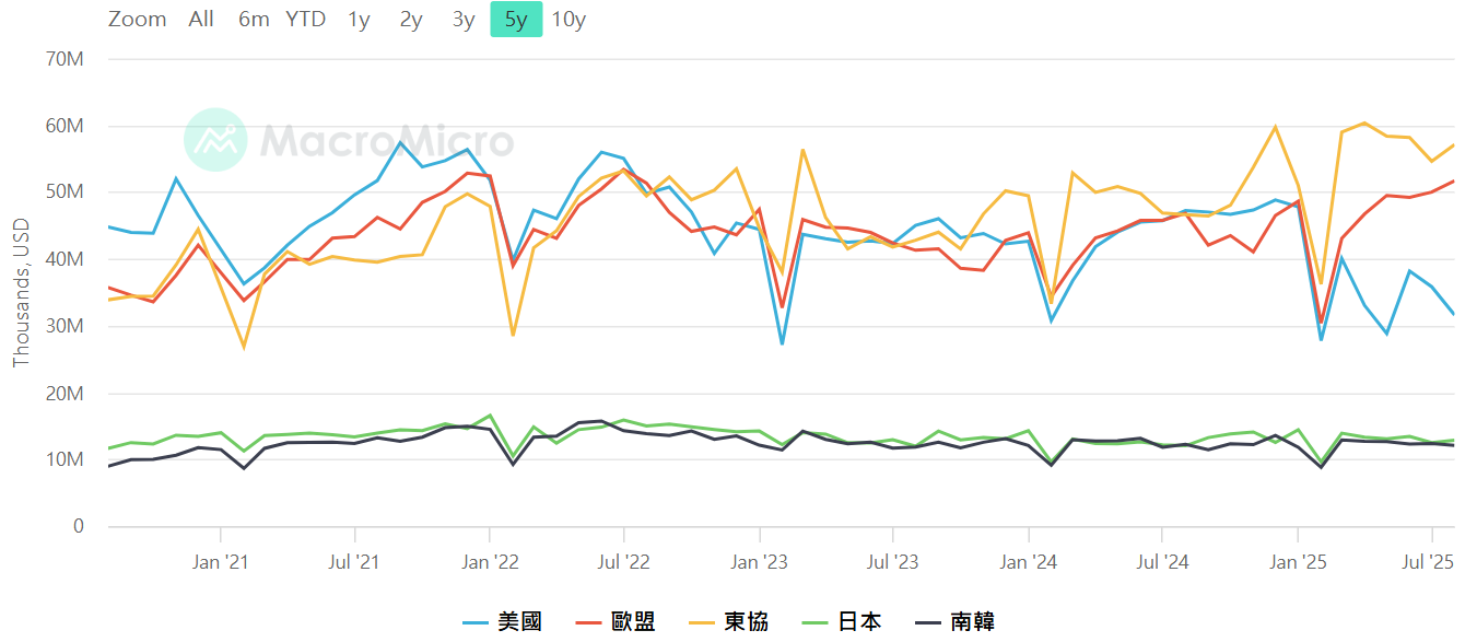 不過中美脫鉤將是未來的長期趨勢,尤其從今年起中國出口至美國的金額銳減即可看出這一點,特別是自5月起,中國已未再進口任何來自美國的黃豆,而是轉向巴西與阿根廷大幅採購。中美衝突在川普任內仍將持續引發短期波動,而這次的回落,反而更應關注科技股高估值與AI投入效率不足等潛在風險。