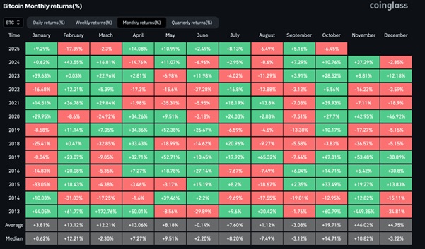 我們正處於加密市場最具盈利潛力的時間視窗——10 月與11 月。歷史資料顯示,比特幣在 10 月平均上漲19%,在 11 月平均上漲46%。