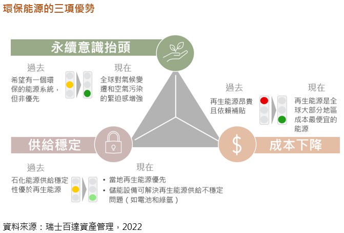 百達環保能源策略投資團隊指出,環保能源相較於傳統能源有三大優勢,第一個是受惠於社會對永續意識的提升、第二個是成本下降,太陽能與風力在很多區域已經是成本最低的能源、第三個則是供給漸趨穩定,太陽能與風力可以在地化生產,降低對油電等進口能源的依賴與不確定性,加上新的儲能科技發展,解決過去供給不穩定的問題。