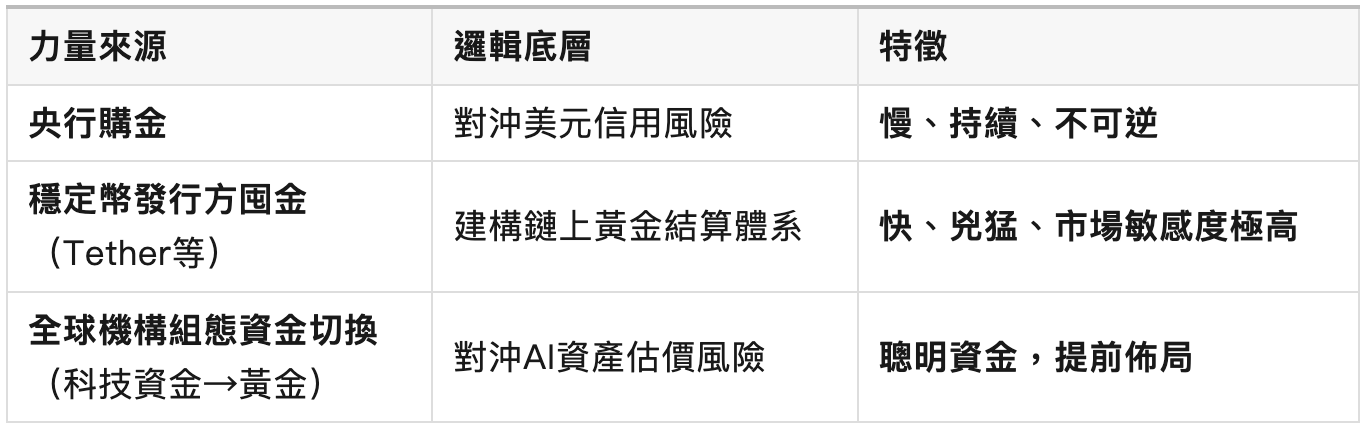 目前黃金買盤出現了罕見的「三元結構疊加」: