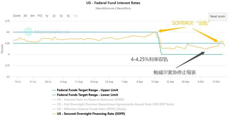 這次的情況也恰恰如此。近一個月來,SOFR數次突破利率上軌4.25%,讓鮑威爾開始警覺。前天SOFR利率大幅出軌,很可能觸發聯準會釋放流動性,將昨日SOFR利率強勢壓回到4.18%。不過釋放流動性直接導致,在SOFR開盤時(美市盤前),美國長短債利率快速下滑,而利率敏感型資產隨之大漲,其中就包括美股和黃金。