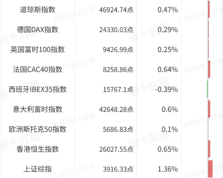 歐洲主要股指多數收漲,法國CAC40指數收漲0.64%;德國DAX30指數收漲0.29%;英國富時100指數收漲0.25%;歐洲斯托克50指數收漲0.1%。