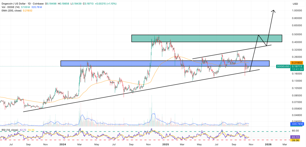 從日線圖來看,儘管近期市場出現小幅回調,DOGE 的整體上升趨勢仍完好。這枚龍頭級迷因幣近期在 長期趨勢線 附近獲得支撐後,價格已重新站上 0.165 美元關口,技術面顯示後續仍有望延續上行走勢。