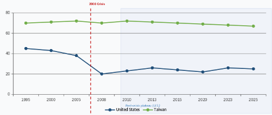 % of Public That Trust Banks Over Time (U.S. vs. Taiwan)