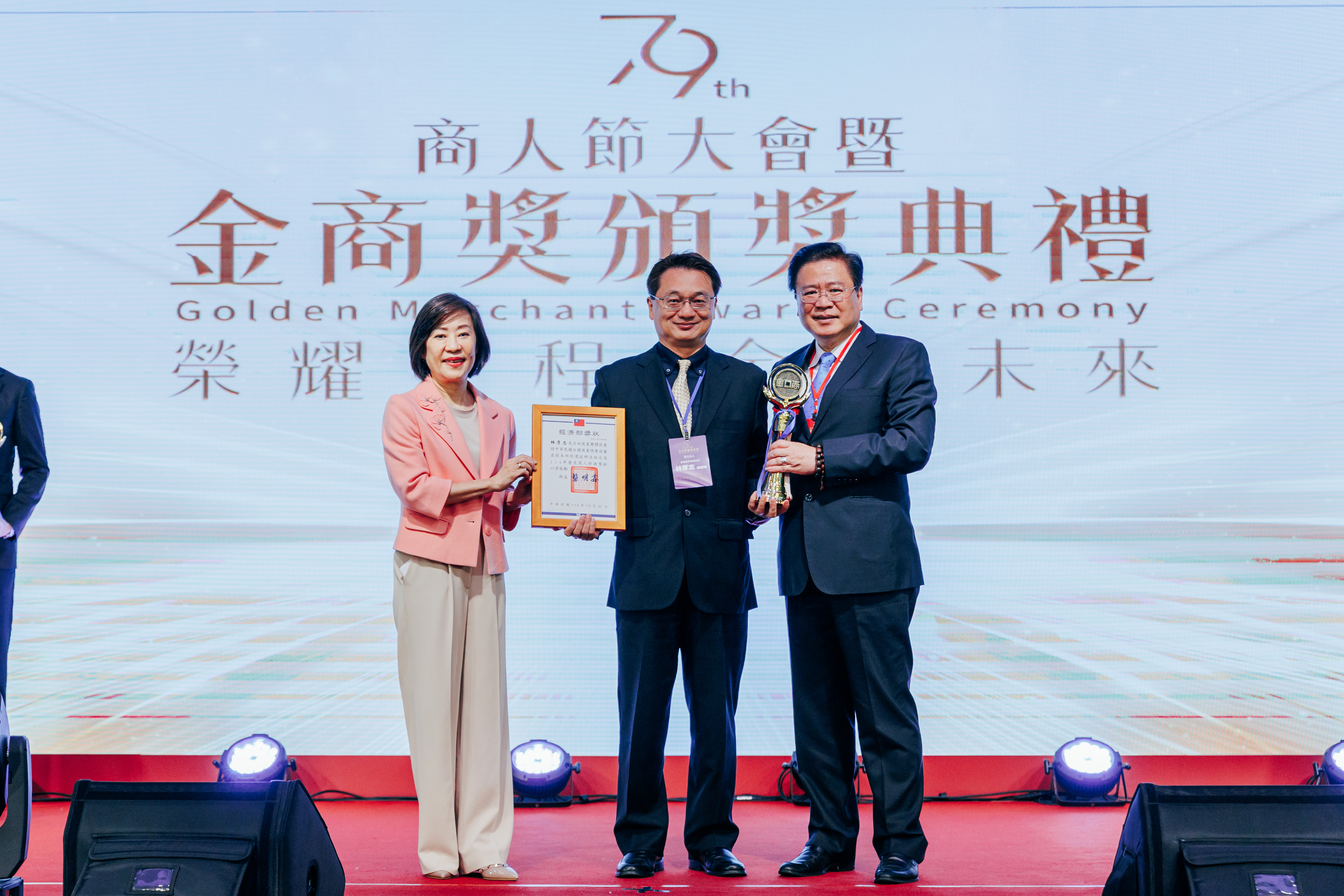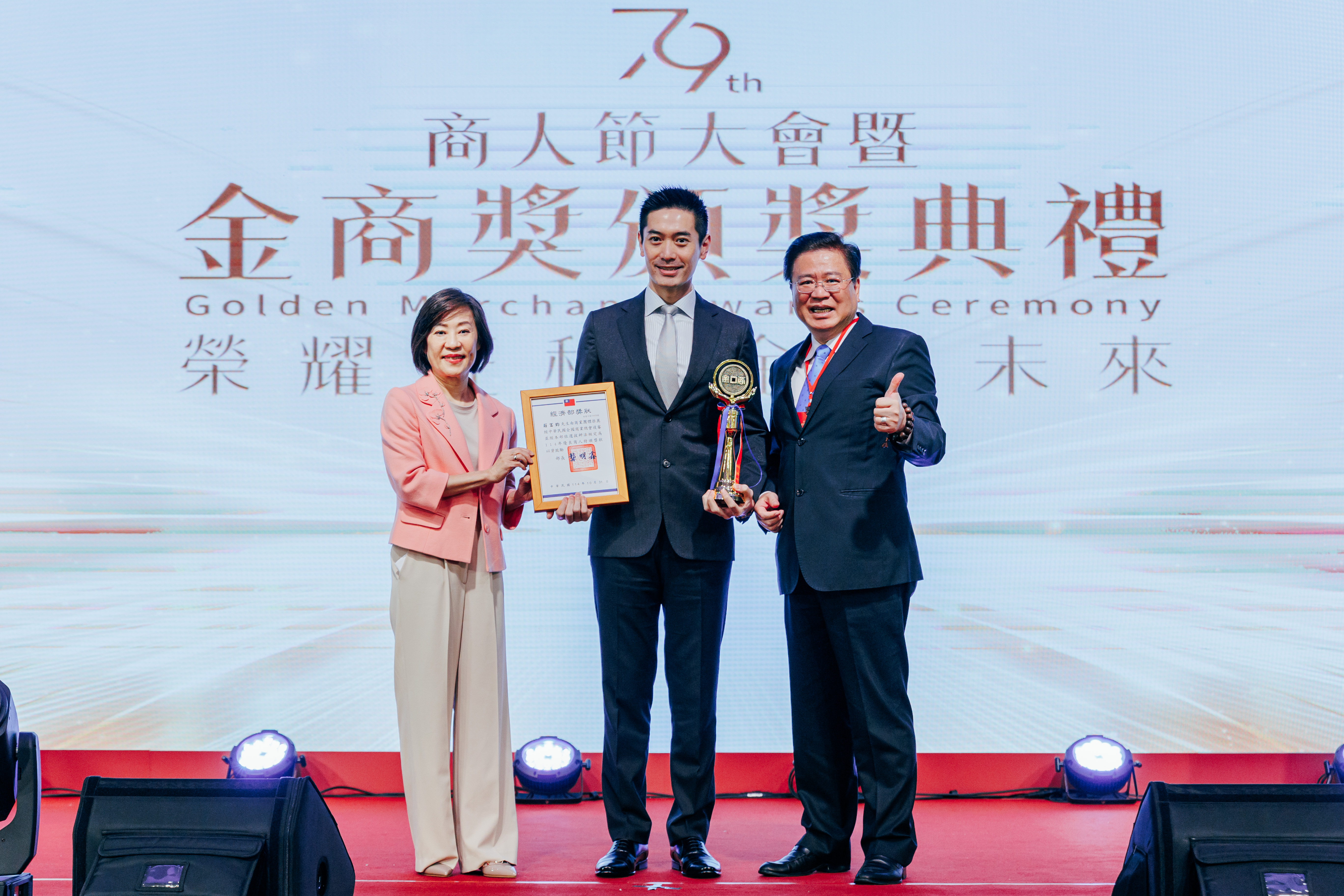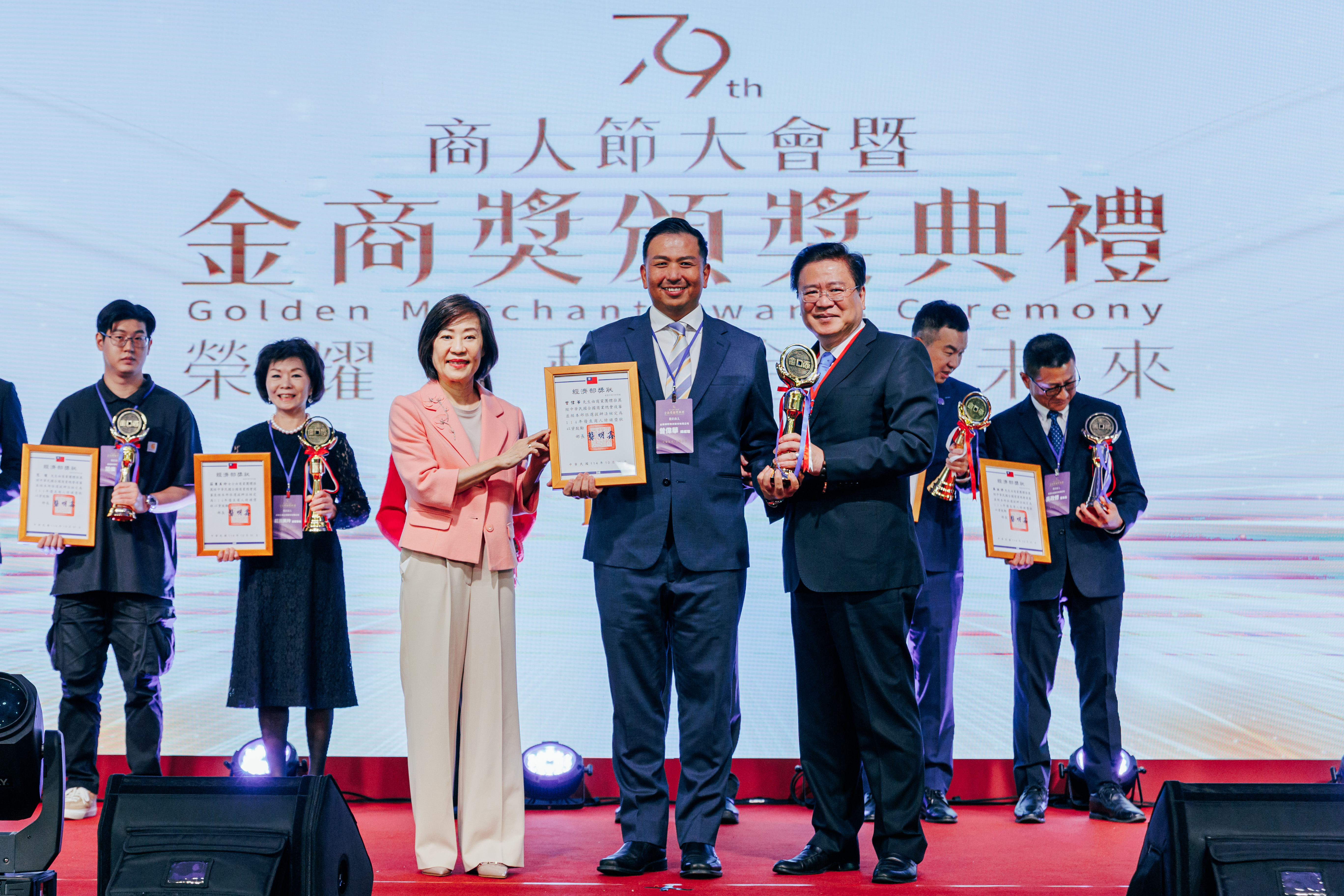 中華民國全國商業總會10/31下午於台北福華大飯店盛大舉辦第79屆商人節暨「金商獎」頒獎典禮,受獎項目分為優良商人、優良外國駐臺商務單位、優良外商、優良老店及菁英老店等,經過嚴格的評選,計有60位獲獎者脫穎而出,每一位都是各行業的標竿典範,對臺灣的經濟成長貢獻良多,深獲各界嘉許與肯定。