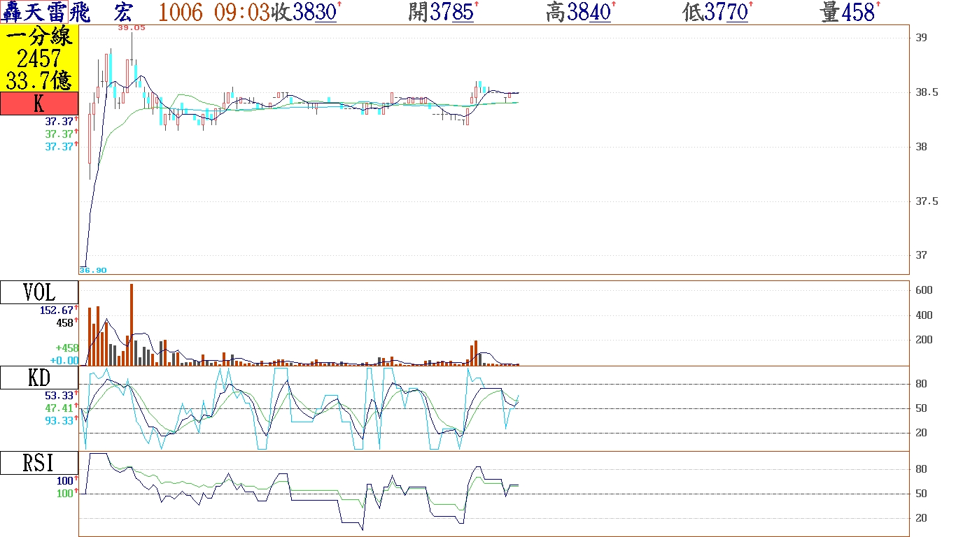 進場後就設定我的停損點在跌破開盤價同時也是持股成本跌1%左右的位置在38.3*0.99附近,37.9這個點,若跌破就慢慢出清。