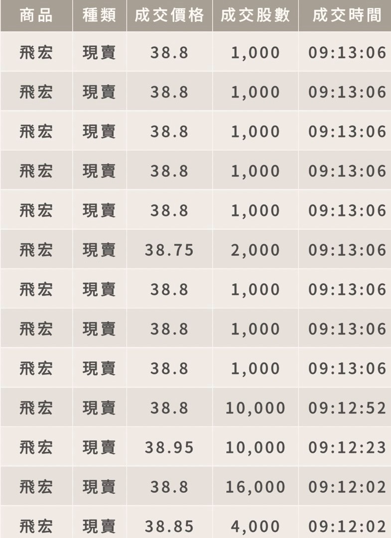 接著進到9:12分那根大量上引線,由於9:06分時我已經決定下次再測到38.8(+5%)這個位置時要出股票,於是9:12隨著飛宏在拉抬時我就開始慢慢往上出,以下是對帳單