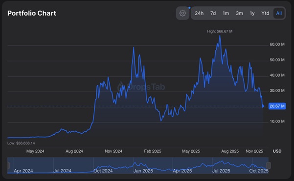 在 2024 年首次提出「迷因幣超級週期」這一概念的人,如今已經以精准捕捉市場拐點而聞名。根據鏈上資料追蹤平臺 DropsTab 的統計,Murad 目前仍持有約 1920 萬美元的未實現收益——儘管他的整體持倉年內已回撤約 40%。