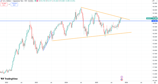 美元/日元上周小幅走低,關鍵性的三角形阻力區間頂部附近面臨了一定的壓力和挑戰。如果最終選擇向上突破,則會打開更多的上行空間,甚至中期突破161.95的高點。持續受制於壓力並回落將暗示市場會進入一段時間的整理。下方主要支撐則位於143/140,跌破後市場趨勢可能出現明顯改變。