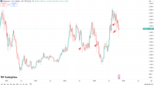 乙太坊/乙太幣上周探底回升,雖然一度承壓,但3000美元的整數支撐正在發揮作用。從過往的走勢來看,長下影線的周線收盤之後,通常都會有反彈和拉鋸行情的展開。作為市場情緒的先行指標,其走勢行情不僅影響比特幣和幣圈,也對貴金屬和美股有一定的參考價值。如果反彈啟動,那麼黃金也有望向上修正,美股則同樣會在高位維持住強勢。