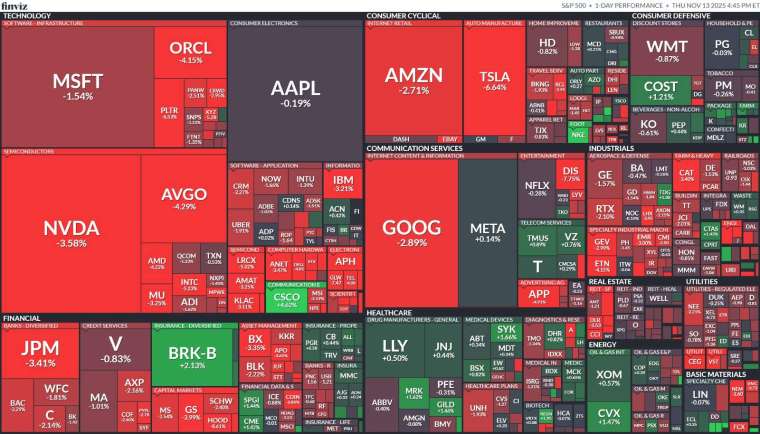 科技股殺聲隆隆,特別是先前受 AI 願景帶動的重量級企業。儘管那斯達克本週初表現強勁,但週四收盤前已連續第三天下挫,主要受到輝達、博通及 Alphabet 等大型科技股拖累。市場普遍關注高估值壓力,並評估 AI 資本支出能否如預期轉化為更廣泛的生產力提升。