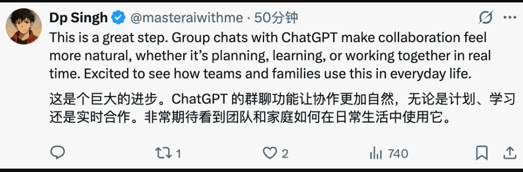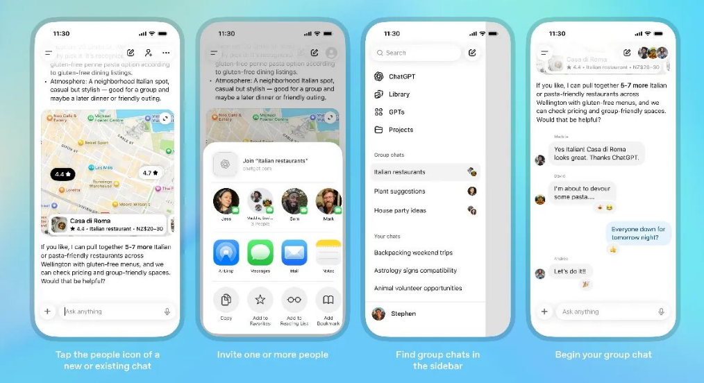 此外,OpenAI 還表示群聊只是 ChatGPT 成為「共享空間」的開始。未來 ChatGPT 會更深入地參與多人協作,幫你激發靈感、做決定。