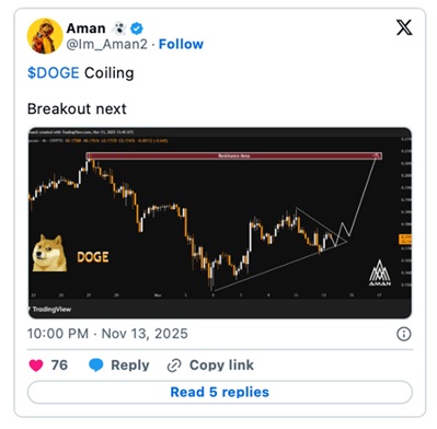 儘管跌幅不小,多位分析師依舊認為 DOGE 可能已經接近這輪熊態週期的尾聲,有望醞釀一次向上的技術性突破。交易員 Aman 最近分享的一張圖表顯示,DOGE 正在形成一個看漲的對稱三角形結構,並且有明顯的上升趨勢線支撐——這種形態在技術分析中往往被視作突破前的蓄力區。