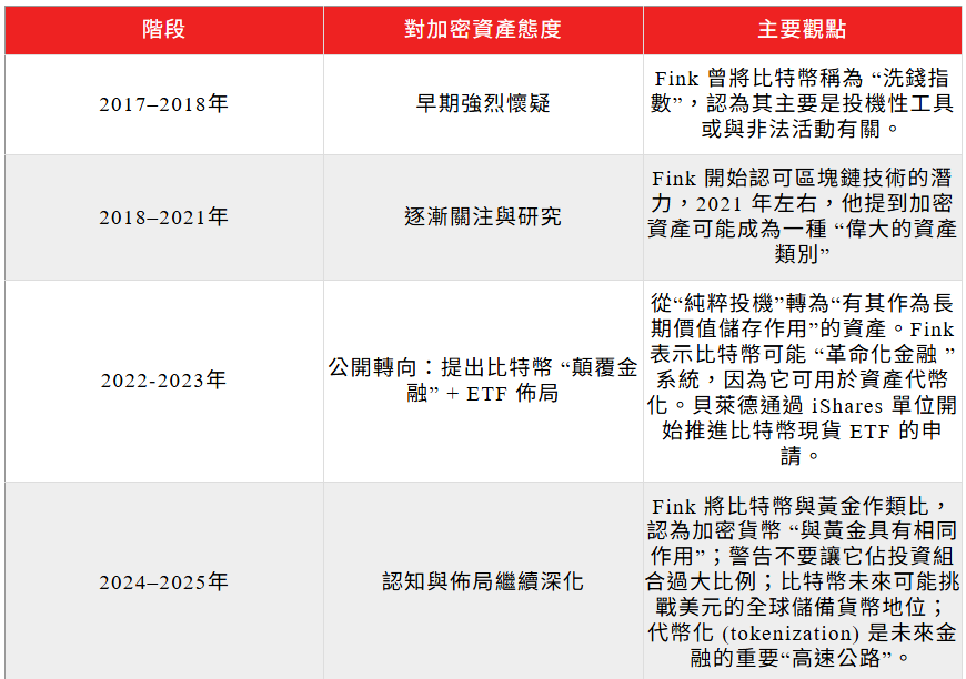早期貝萊德也是對加密資產持消極態度,2017年,CEO拉里·芬克公開稱比特幣為 "洗錢的指數" ,對加密貨幣持明確否定態度,認為其與非法活動關聯密切。此後逐漸鬆動,進而轉向接納。