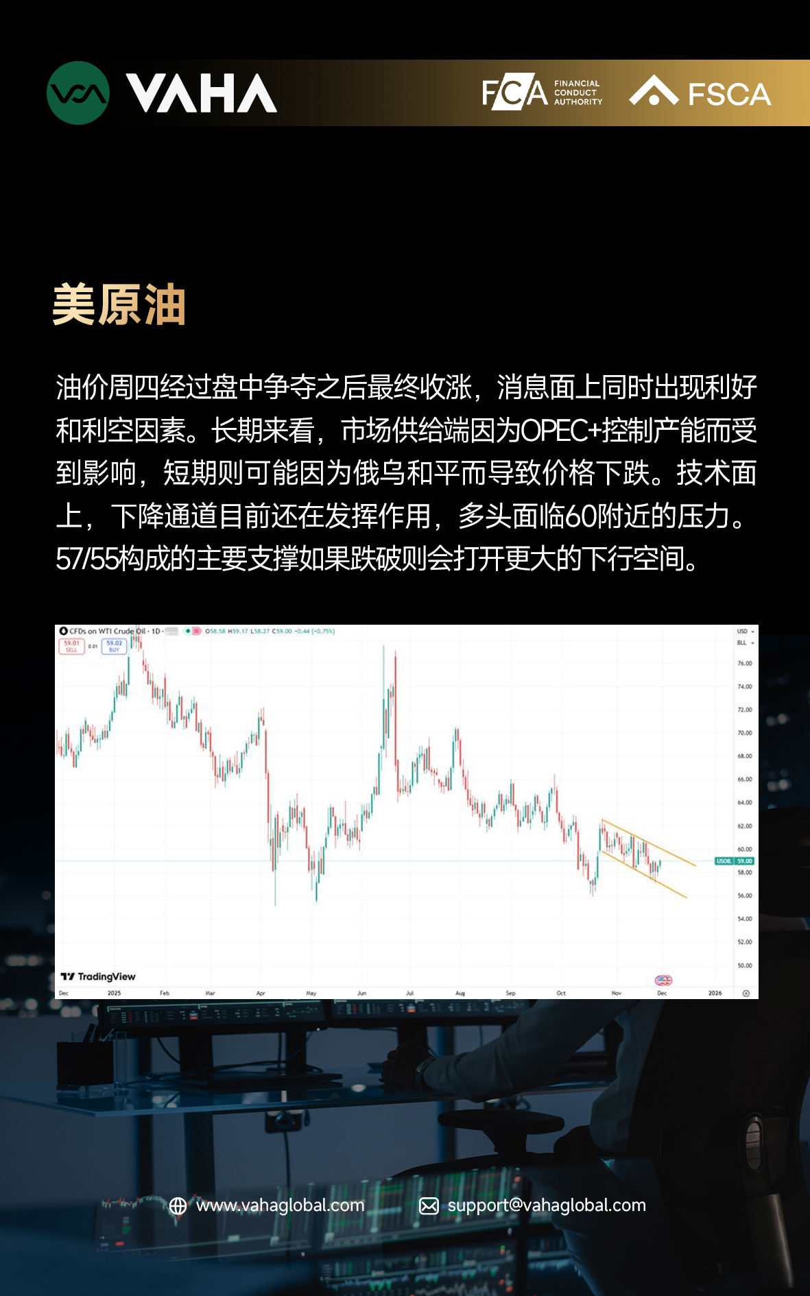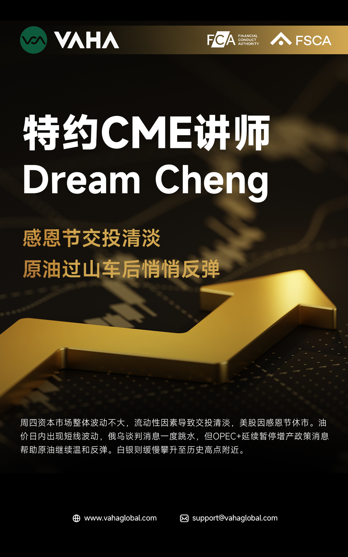 週四資本市場整體波動不大,流動性因素導致交投清淡,美股因感恩節休市。油價日內出現短線波動,俄烏談判消息一度跳水,但OPEC+延續暫停增產政策消息説明原油繼續溫和反彈。白銀則緩慢攀升至歷史高點附近。
